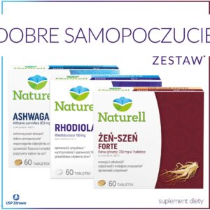 Usp Zdrowie Zestaw DOBRE SAMOPOCZUCIE – Naturell Ashwagandha, 60tabl. + Rhodiola B, Żeń-szeń FORTE