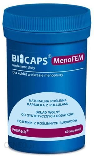 BICAPS® MENOFEMsuplement diety – 60 kapsułekBICAPS MenoFEM to połączenie 5 składników przeznaczonych dla kobiet w okresie menopauzy.W skład produktu wchodzi m.in. kwas foliowy (aktywna forma L-metylofolian wapnia), naturalna wit. D (z lanoliny) oraz standaryzowane ekstrakty z czerwonej koniczyny i niepokalanka.5 składników- aktywna forma folianu (L-metylofolian wapnia)- wysoko przyswajalny wapń (cytrynian wapnia)- naturalna wit. D (z lanoliny)- standaryzowany ekstrakt z korzenia niepokalanka- standaryzowany ekstrakt z czerwonej koniczynyPrzejrzysty skład – Produkt nie zawiera m.in.sztucznych substancji wypełniających oraz konserwujących.Naturalna kapsułka z pullulanu – Pozyskiwanego na drodze fermentacji.Czerwona koniczyna wspomaga kobietę w okresie występowania dolegliwości związanych z menopauzą. Niepokalanek przyczynia się do utrzymania równowagi hormonalnej. Wapń i wit. D pomagają w utrzymaniu zdrowych kości. Foliany przyczyniają się m.in. do zmniejszenia uczucia zmęczenia i znużenia.SKŁAD PRODUKTUZalecana porcja dzienna (2 kapsułki) zawiera (referencyjna wartość spożycia %):Kwas foliowy – 600 µg (300%)Wapń – 133 mg (16,6%)Witamina D – 50 ug (1000%) / 2000 IUEkstrakt z korzenia niepokalanka – 100 mg, w tym 0,6 mg aukubinEkstrakt z czerwonej koniczyny – 400 mg, w tym 32 mg izoflawonów.IU – International Unit (1 µg = 40 IU)Składniki: wapń (cytrynian wapnia), ekstrakt z czerwonej koniczyny (Trifolium pratense L.), pullulan (otoczka kapsułki). ekstrakt z korzenia niepokalanka (Vitex agnus-castus L.), kwas foliowy ( L-metylofolian wapnia), witamina D (cholekalcyferol).SPOSÓB UŻYCIASpożywać 2 kapsułki 1 raz dziennie w trakcie posiłku.Masa netto: 34,4 gIlość kapsułek / porcji: 60/30.ŚRODKI OSTROŻNOŚCIProdukt jest przeznaczony dla kobiet w okresie menopauzy. Nie należy przekraczać zalecanej dziennej porcji do spożycia w ciągu dnia. Produkt nie może być stosowany jako substytut zróżnicowanej diety. Nie stosować w przypadku uczulenia na którykolwiek ze składników. Zalecamy zrównoważony sposób żywienia i zdrowy tryb życia. Przed zastosowaniem produktu wskazane jest wykonanie badania 25-(OH)D we krwi oraz skonsultowanie wyniku badania z lekarzem lub farmaceutą. Dieta bogata w izoflawony (zawierająca rośliny strączkowe, w tym soję) nie wymaga suplementacji. U kobiet z chorobą nowotworową stosować wyłącznie po konsultacji z lekarzem.INFORMACJE O PRODUCENCIE:Firma FORMEDS samego początku specjalizuje się w produkcji suplementów diety bez chemicznych dodatków.Priorytetem firmy FORMEDS jest oferowanie naturalnych, skutecznych oraz bezpiecznych wyrobów. Opracowywanie nowej receptury i każdy etap testowania podlega ścisłej kontroli. Posiadają wykwalifikowaną kadrę doświadczonych specjalistów.Cały proces produkcji zgodny jest z procedurami HACCP i wszystkie jego etapy są udokumentowane. Szczegółowe badania produktów gotowych są prowadzone przez certyfikowane i niezależne laboratoria. Wytwarzanie odbywa się na nowoczesnych liniach produkcyjnych gwarantujących najwyższy standard oferty finalnej.Składnikami suplementów diety są surowce o najwyższej jakości pozyskiwane od renomowanych europejskich dostawców.Wszystkie produkty firmy FORMEDS Sp. z o. o. znajdują się w Rejestrze Głównego Inspektoratu Sanitarnego oraz w Bazie Leków i Środków Ochrony Zdrowia KS- BLOZ.Produkty firmy FORMEDS są stale doceniane prestiżowymi certyfikatami, takimi jak: Jakość Roku® 2018, Jakość Roku® 2017, Jakość Roku® 2016, Symbol Innowacji 2016, Produkt Roku 2016.