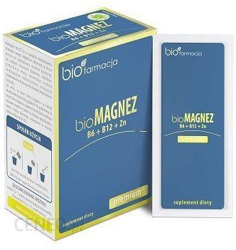 BIO MAGNEZ PREMIUM Z B6 B12 ORAZ CYNKIEM 20 SASZETEK BIOFARMACJA CYTRYNIAN MAGNEZU Z MORZA MARTWEGO, CYTRYNIAN CYNKUBio Magnez z witaminą B6 to produkt zalecany do stosowania dla osób stosujących dietę ubogą w minerały i witaminy niezbędne do prawidłowego funkcjonowania układu nerwowego i odpornościowego, utrzymywania właściwej pracy serca i ciśnienia krwi, a także optymalnej pracy mięśni. W składzie preparatu znajdziemy pozyskany z Morza Martwego cytrynian magnezu, cytrynian cynku, witaminę B6 i B12. Wszystkie z wymienionych substancji odgrywają niezwykle ważną rolę w prawidłowym funkcjonowaniu ludzkiego organizmu.Bio Magnez z witaminą B6 zalecany jest do stosowania w celu utrzymania równowagi elektrolitowej, zapewniania właściwej pracy mięśni i układu nerwowego, potrzymania optymalnej syntezy białek, zachowania właściwego metabolizmu kwasowo-zasadowego, lipidowego i węglowodanowego, optymalnego działania układu krwiotwórczego, regulacji gospodarki hormonalnej czy prawidłowego funkcjonowania układu immunologicznego. Jeśli uprawiasz sport lub wykonujesz stresującą pracę, stosowanie właściwej suplementacji może pomóc w uzupełnieniu ewentualnych niedoborów potrzebnych Ci substancji.Zalecana porcja w ciągu dnia: 1 saszetka. Zawartość saszetki zmieszać z wodą/sokiem (200-300ml) i wypić.Nie przekraczać zalecanej dziennej porcji. Suplement diety nie może być stosowany jako substytut (zamiennik) zróżnicowanej diety. Dla zdrowia ważna jest zróżnicowana dieta i zdrowy styl życia.Przechowywać w suchym miejscu niedostępnym dla dzieci. Chronić przed wilgocią.Skład:1 saszetkaMagnez: 300 mg / 80 % RWSCynk: 10 mg / 100 % RWSWitamina B6 : 1,4 mg / 100 % RWSWitamina B12: 2,5 mcg / 100 % RWScytrynian magnezu (pozyskany z Morza Martwego), cytrynian cynku, witamina B6 (chlorowodorek pirydoksyny), witamina B12 (cyjanokobalamina).
