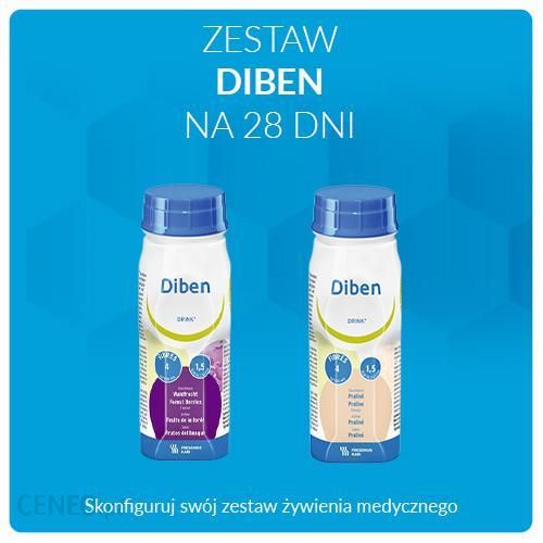 Zestaw zawiera 56 butelek Diben Drink po 200mlDiben DRINK to żywność specjalnego przeznaczenia medycznego o niskim indeksie glikemicznym (IG zaburzeniami metabolizmu glukozy,cukrzycą,insulinoopornością.Podawanie:Powinno być ustalane przez personel medyczny w zależności od indywidualnego zapotrzebowania pacjenta. Zalecane podawanie w żywieniu całkowitym: 5-7 butelek (1500-2100 kcal) /dobę lub uzupełniającym: 2-3 butelki (600-900 kcal) /dobę.Składniki:owoce leśne:Woda, białko mleka, skrobia modyfikowana, maltodekstryna, oleje roślinne (olej rzepakowy, olej słonecznikowy), fruktoza, trójglicerydy o średniej długości łańcucha (MCT), aromaty, cytrynian potasu, olej rybny, emulgatory (E 471, lecytyny sojowe), proszek z buraków, chlorek sodu, wodorowinian choliny, regulator kwasowości (E 524), wit. C, substancje słodzące (cyklaminian sodu, sacharynian sodu), tlenek magnezu, pirofosforan żelaza, siarczan cynku, wit. E, niacyna, kwas pantotenowy, chlorek manganu, siarczan miedzi, wit. B2, wit. B1, wit. B6, fluorek sodu, β-karoten, wit. A, kwas foliowy, chlorek chromu, jodek potasu, molibdenian sodu, selenin sodu, wit. K1, biotyna, wit. D3, wit. B12.pralinowy:Woda, białko mleka, skrobia modyfikowana, oleje roślinne (olej rzepakowy, olej słonecznikowy), maltodekstryna, fruktoza, trójglicerydy o średniej długości łańcucha (MCT), cytrynian potasu, olej rybny, barwnik (E 150c), emulgatory (E 471, lecytyny sojowe), aromat, chlorek sodu, wodorowinian choliny, regulator kwasowości (E 524), wit. C, substancje słodzące (cyklaminian sodu, sacharynian sodu), tlenek magnezu, pirofosforan żelaza, siarczan cynku, wit. E, niacyna, kwas pantotenowy, chlorek manganu, siarczan miedzi, wit. B2, wit. B1, wit. B6, fluorek sodu, ß-karoten, wit. A, kwas foliowy, chlorek chromu, jodek potasu, molibdenian sodu, selenin sodu, wit. K1, biotyna, wit. D3, wit. B12.