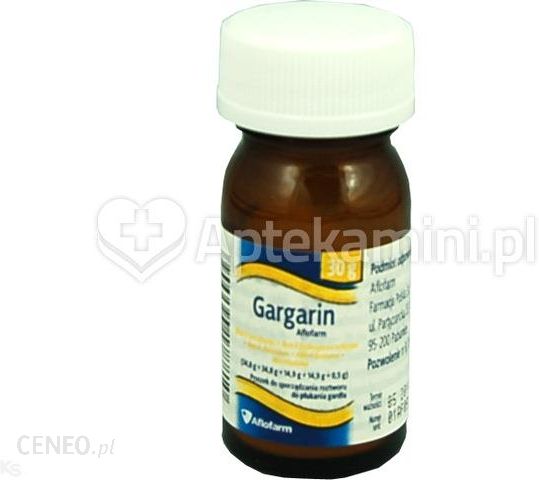 Nazwa: Gargarin AflofarmPostać: pr.do p.roztw.Dawka: -Opakowanie: 30 g (słoik)Skład: 100 g proszku zawiera substancje czynne: Boraks (Borax) 34,8 g Sodu wodorowęglan (Natrii hydrogenocarbonas) 34,8 g Sodu chlorek (Natrii chloridum) 14,9 g Sodu benzoesan (Natrii benzoas) 14,9 g Mentol (Mentholum) 0,5 g Pełny wykaz substancji pomocniczych, patrz punkt 6.1.Działanie: – odkażające,- ściągające,- przeciwzapalne,- słabo wykrztuśne,- miejscowo przeciwbólowe.Wskazania: Pomocniczo w stanach zapalnych jamy ustnej i gardła w przebiegu nieżytów górnych dróg oddechowych, anginy, infekcji wirusowych i zakażeń grzybiczych.: – Nadwrażliwość na substancję czynną lub na którąkolwiek substancję pomocniczą wymienioną w punkcie 6.1. – Uszkodzona powierzchnia błon śluzowych.Działania niepożądane: Przy krótkotrwałym stosowaniu produkt leczniczy jest dobrze tolerowany. Mogą wystąpić poniżej wymienione działania niepożądane. Zaburzenia żołądka i jelit brak łaknienia, wymioty, biegunka, śluzowo-krwawe wymioty. Zaburzenia nerek i dróg moczowych bezmocz. Zaburzenia skóry i tkanki podskórnejwysypka skórna, wyłysienie. Zaburzenia krwi i układu chłonnego niedokrwistość. Zaburzenia układu immunologicznego gorączka. Zgłaszanie podejrzewanych działań niepożądanych Po dopuszczeniu produktu leczniczego do obrotu istotne jest zgłaszanie podejrzewanych działań niepożądanych. Umożliwia to nieprzerwane monitorowanie stosunku korzyści do ryzyka stosowania produktu leczniczego. Osoby należące do fachowego personelu medycznego powinny zgłaszać wszelkie podejrzewane działania niepożądane za pośrednictwem Departamentu Monitorowania Niepożądanych Działań Produktów Leczniczych Urzędu Rejestracji Produktów Leczniczych, Wyrobów Medycznych i Produktów BiobójczychInterakcje: Leki powodujące przekrwienie błon śluzowych mogą zwiększać prawdopodobieństwo wchłaniania składników produktu leczniczego do krążenia ogólnego.Dawkowanie: Zewnętrznie do płukania gardła: ½ -1 łyżeczki na ½ szklanki ciepłej wody, płukać 3 razy dziennie.Środki ostrożności: Podczas płukania gardła należy uważać aby nie połykać produktu. Przy stosowaniu produktu na uszkodzoną powierzchnię błon śluzowych istnieje możliwość kumulowania związków boru w organizmie. Długotrwałe stosowanie produktu leczniczego ze względu na zawartość boraksu, zwłaszcza u małych dzieci może zwiększać ryzyko kumulacji związków boru w tkankach i narządach organizmu, głównie w mózgu, wątrobie, śledzionie i nerkach oraz w tkance tłuszczowej.Prowadzenie pojazdów: Produkt leczniczy w zalecanych dawkach nie powoduje upośledzenia sprawności psychofizycznej, zdolności prowadzenia pojazdów i obsługiwania maszyn.Przedawkowanie: Nie zgłoszono żadnego przypadku przedawkowania produktu leczniczego.Ciąża: Brak jest wystarczających danych dotyczących stosowania produktu u kobiet w ciąży.