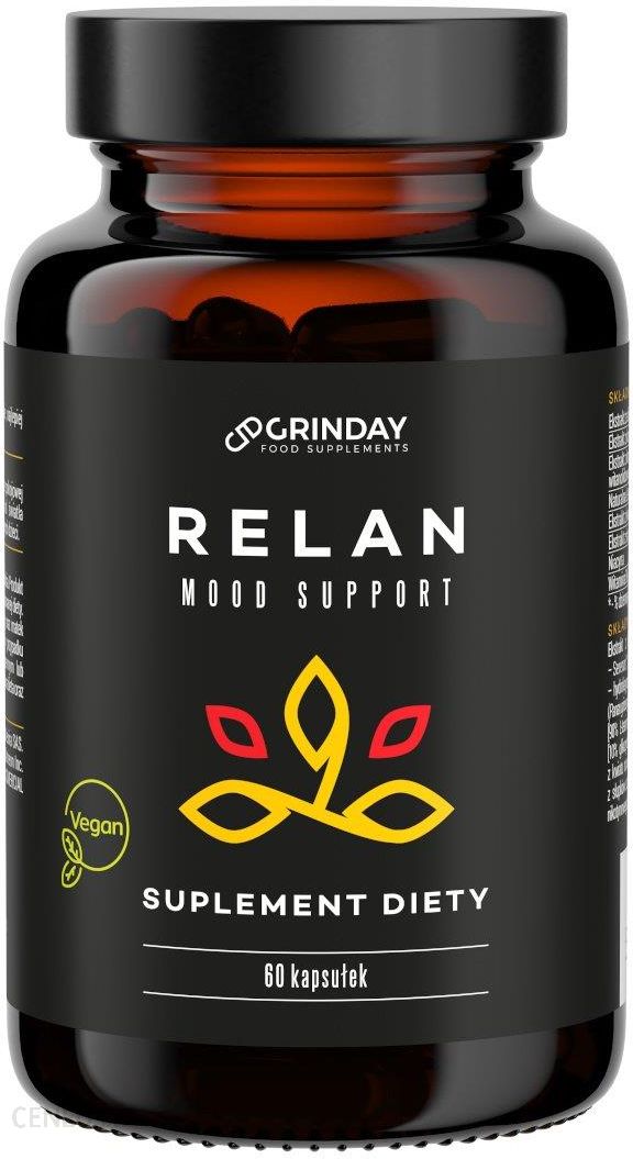 Grinday Relan Stres Nerwy Uspokojenie 60kapsGRINDAY RELAN Mood suport to suplement diety wskazany do spożycia w celu dostarczenia składników aktywnych wykazujących działanie uspakajające, redukujące stres i przywracające dobry nastrój.