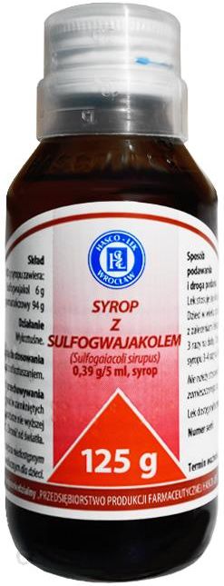 LekWskazania: trudności z odkrztuszaniem.Skład: 100g syropu zawiera: substancje czynne: sulfogwajakol 6g, substancje pomocnicze: syrop pomarańczowy 94g.Działanie: wykrztuśne.Dawkowanie: doustnie:- dzieci w wieku od 6. do 12. lat: 5ml syropu 3 razy na dobę;- dzieci w wieku powyżej 12. lat i dorośli: 10ml syropu 3-4 razy na dobę.Nie podawać większych dawek niż zalecane.Przeciwwskazania: uczulenie na którykolwiek ze składników leku. Stosowanie leku u dzieci poniżej 6. lat, kobiet w ciąży i karmiących piersią powinno być skonsultowane z lekarzem. Nie zaleca się stosowania leku bezpośrednio przed lub w trakcie prowadzenia pojazdu.Lek zawiera etanol.