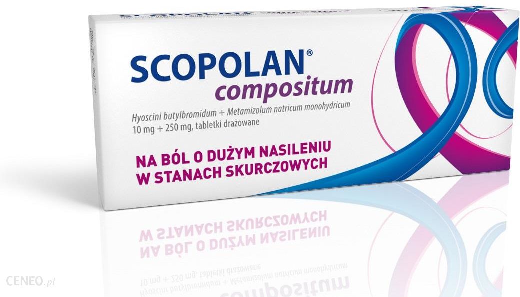 Scopolan Compositum 10Tabl.Scopolan jest lekiem zawierającym butylobromek hioscyny, który znosi stany skurczowe mięśni gładkich w obrębie jamy brzusznej. Działanie rozkurczowe powoduje złagodzenie bolesnych skurczy przewodu pokarmowego, dróg żółciowych oraz układu moczowo – płciowego. Ponadto zawiera Metamizol sodowy, który działa silnie przeciwbólowo i przeciwgorączkowo, a słabiej przeciwzapalnie. Wykazuje ponadto słabe działanie spazmolityczne i uspokajające.WskazaniaKrótkotrwałe leczenie dolegliwości bólowych o dużym nasileniu w stanach skurczowych przewodu pokarmowego (np. skurcze żołądka, kolka jelitowa, zespół jelita drażliwego), dróg żółciowych (np. kolka żółciowa), układu moczowo-płciowego (np. kolka nerkowa, stany skurczowe związane z kamicą moczowodową, bolesne miesiączkowanie). Lek jest wskazany w sytuacji, gdy stosowanie innych preparatów jest przeciwwskazane lub nieskuteczne.Skład1 tabletka zawiera substancje czynne: butylobromek hioscyny (Hyoscini butylbromidum) 10mg, metamizol sodowy jednowodny (Metamizolum natricum monohydricum) 250mg, substancje pomocnicze: sacharoza, talk, skrobia ziemniaczana, guma arabska, żelatyna wieprzowa, glicerol, magnezu stearynian, tytanu dwutlenek (E171).DziałaniePrzeciwbólowe, przeciwgorączkowe, przeciwzapalne i rozkurczoweDawkowanieDoustnie. Stosować doraźnie. Dorośli: 1-2 tabl. jednorazowo, przy nasilonych bólach można podawać do 3 razy na dobę. Nie stosować u dzieci i młodzieży w wieku poniżej 18 lat. Należy poinformować pacjenta, że jeśli objawy będą się utrzymywać dłużej niż 3 dni od rozpoczęcia leczenia lub nasilą się mimo stosowania leku, pacjent powinien przerwać leczenie i skonsultować się z lekarzem.PrzeciwwskazaniaNadwrażliwość na substancje czynne lub na którąkolwiek substancję pomocniczą. Nie stosować preparatu jeśli u pacjenta występuje uczulenie na alkaloidy tropanowe (np. atropinę) i ich pochodne, nadwrażliwość na pirazolony i inne niesteroidowe leki przeciwzapalne, zmiany w obrazie morfologicznym krwi: leukopenia, granulocytopenia, niedokrwistość, wrodzony niedobór G-6-PD, ostra porfiria wątrobowa, ostra niewydolność nerek lub wątroby, jaskra z wąskim kątem przesączania, rozrost gruczołu krokowego, niedrożność porażenna jelit, zaparcia atoniczne, zwężenie przełyku, wpustu lub odźwiernika żołądka, zwężenie szyi pęcherza moczowego, tachykardia, nużliwość mięśni (myasthenia gravis), patologiczne poszerzenie jelita grubego (megacolon). Ciąża i okres karmienia piersią. Nie stosować u dzieci i młodzieży w wieku poniżej 18 lat.Przed użyciem zapoznaj się z ulotką, która zawiera wskazania, przeciwwskazania, dane dotyczące działań niepożądanych, dawkowanie oraz informacje dotyczące stosowania produktu leczniczego bądź skonsultuj się z lekarzem lub farmaceutą, gdyż każdy lek niewłaściwie stosowany zagraża Twojemu życiu lub zdrowiu.