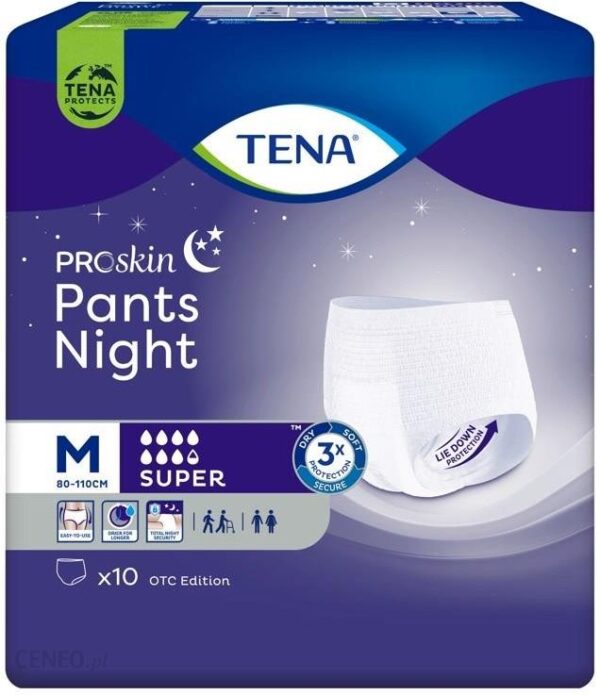 Dowiedz się więcej Dlaczego TENA Pants Super Night?Nietrzymanie moczu jest dolegliwością, z którą można skutecznie walczyć. Jeśli jednak chcesz zachować kontrolę, pełen komfort i bezpieczeństwo, musisz sięgnąć po najlepszej jakości produkty dedykowane osobom z nietrzymaniem moczu. Dzięki temu ponownie poczujesz się swobodnie i odzyskasz dobre samopoczucie.Gwarancja ochrony to podstawaNietrzymanie moczu jest krępujące, dlatego każda osoba, która się z nim zmaga, pragnie zachować je w tajemnicy. Dzięki TENA Pants Super Night masz taką możliwość! Majtki chłonne TENA są wyjątkowo cienkie, dlatego bez trudu ukryjesz je pod ubraniem. Stworzone zostały z najwyższej jakości, bardzo delikatnych materiałów, które chronią skórę przed podrażnieniami, dlatego poczujesz się w nich niezwykle komfortowo i zapomnisz o tym, że masz je na sobie. Do tego są bardzo skuteczne – wyjątkowo chłonne, wzmocnione dodatkowymi barierkami, które zapobiegają niekontrolowanemu przeciekaniu niezależnie od tego, jaką pozycję przyjmujesz.Czy TENA Pants Super Night jest właśnie dla mnie?TENA Pants Super Night to najskuteczniejsza odpowiedź na nietrzymanie moczu. Jeśli nie masz pewności, czy jest to produkt właściwy dla Ciebie, sięgnij także po inne produkty, np. TENA Pants Normal lub TENA Pants Plus.