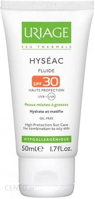 URIAGE HYSÉAC FLUID PRZECIWSŁONECZNY DO SKÓRY TRĄDZIKOWEJ SPF 50+ 50 mlWysoka ochrona przed promieniowaniem UVA-UVB. Starannie dobrane filtry i substancje aktywne zapewniają efekt matujący, właściwy poziom nawilżenia oraz działanie przeciwzapalne. Nie powoduje powstawania zaskórników. Odporny na pot i wodęWskazaniaSkóra tłusta i mieszana twarzy narażona na działanie promieniowania UVA-UVB, doskonały po zabiegach dermatologicznychSposób użyciaRozprowadzić równomiernie na powierzchni skóry twarzySkładWoda Termalna Uriage, Tinosorb M, wyciąg z wierzbownicy (Epilobium), witamina E, fitosterole, gliceryna
